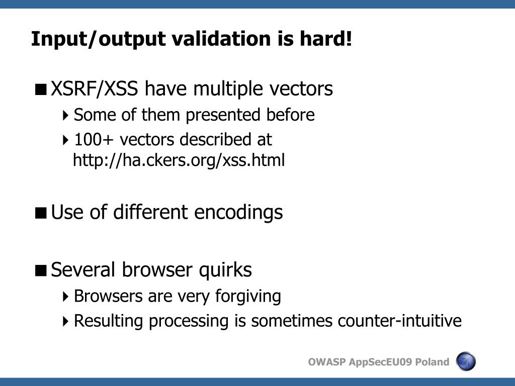 Input/output validation is hard! • XSRF/XSS have multiple vectors • Some of them presented before • 100+ vectors described at http://ha.ckers.org/xss.html • Use of different encodings • Several browser quirks • Browsers are very forgiving • Resulting processing is sometimes counter-intuitive