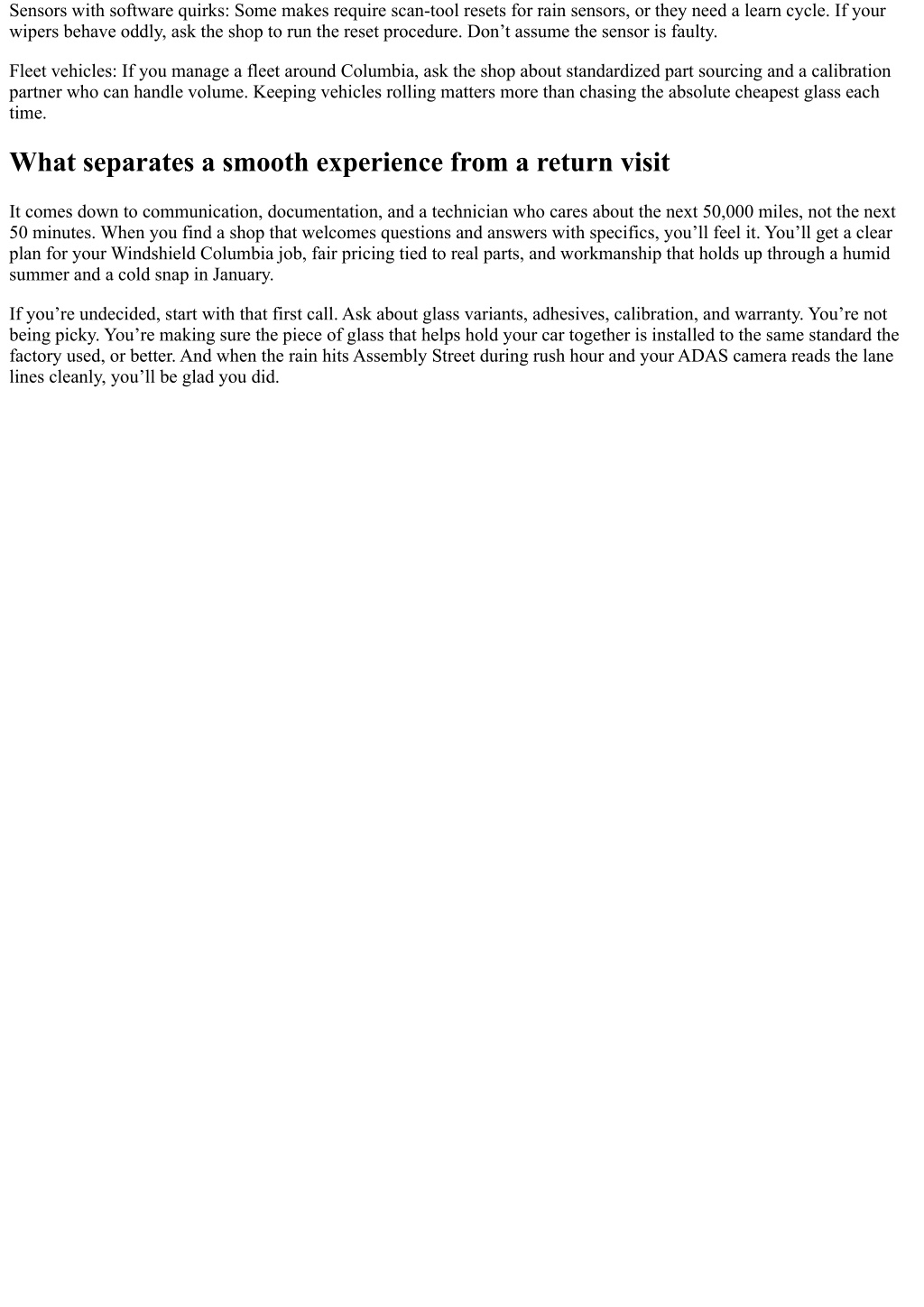 Don’t overlook the sensor stack: rain, light, humidity, and HUD A modern windshield is a sensor host. Common items tucked near the rear-view mirror include rain sensors, light sensors, humidity sensors for auto-defog, camera modules, and for some vehicles, an infrared lane camera or night vision emitter. Some windshields also have acoustic lamination to keep the cabin quiet or a heads-up display reflective layer that makes the projection crisp. Ask whether your replacement glass supports these features. HUD windshields are different. An incorrect part will make the projection double, dim, or shift. Rain sensors require a clear gel pad or tape set perfectly over a prepared patch on the glass. If a tech handles the gel pad with bare hands or traps a bubble, your wipers will behave erratically. I’ve chased more than one “haunted wiper” complaint back to a contaminated sensor gel. A good shop will show you the feature list tied to your VIN and confirm the correct glass variant. That conversation should happen before the truck leaves the warehouse. The technician matters more than the logo on the door Two shops can use the same brand of glass and adhesive and get different results. Experience shows in a few subtle ways. The best techs dry-fit the glass to check alignment and gaps before laying urethane. They replace every clip that resists. They protect the dash and the paint with fender covers and pull the cowl carefully. They don’t pry with a screwdriver where a trim tool belongs. Ask who will work on your vehicle, how many windshields they’ve done on your make, and what they do if the pinchweld reveals rust. Rust deserves attention right then, with cleaning and primer, not a dab-and-go. On older trucks around Columbia, I’ve seen pinchweld rust under the lower edge from years of pine needles. Done right, the tech stops, shows you, treats it, and resets the clock on the vehicle’s lifespan. Timeline, scheduling, and what you should prepare A complete job with calibration can be two to four hours if everything is in stock and straightforward. If a dealer must perform the calibration, it can stretch to a full day or next morning. Summer humidity may lengthen safe drive-away time. Before your appointment, remove toll tags or dash cams stuck to the old glass, and photograph your windshield’s stickers if you need to transfer them. Bring replacement registration or parking decals if required. If you have ceramic tint or a brow strip, discuss preservation or reapplication. Most shops in Columbia will offer mobile service within a reasonable radius, often free. If they come to your office, reserve a flat space with room to open the doors and deploy a canopy if needed. Avoid gravel lots that kick dust into the urethane. What a thorough post-install check looks like Take ten minutes with the vehicle before you leave. Look along the edges, inside and out, for uniform gaps and hidden urethane. Run the wipers dry for a few sweeps to confirm smooth operation and no chatter. Spray the glass and roof edge with water and check for drips into the headliner and A-pillars. Test rain-sensing wipers if equipped by wetting the sensor area. Verify lane keep assist, forward collision warning, and adaptive cruise icons initialize without error messages. If the shop performed static calibration, they might still need a short dynamic drive to finalize. A meticulous shop will walk you through this without being asked and hand you calibration documentation. Keep that paperwork with your maintenance records. Red flags you can spot on the phone A few patterns I’ve learned to avoid: