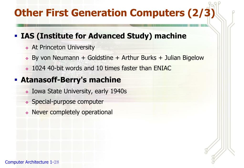 Other First Generation Computers (2/3) • IAS (Institute for Advanced Study) machine • At Princeton University • By von Neumann + Goldstine + Arthur Burks + Julian Bigelow • 1024 40-bit words and 10 times faster than ENIAC • Atanasoff-Berry's machine • Iowa State University, early 1940s • Special-purpose computer • Never completely operational