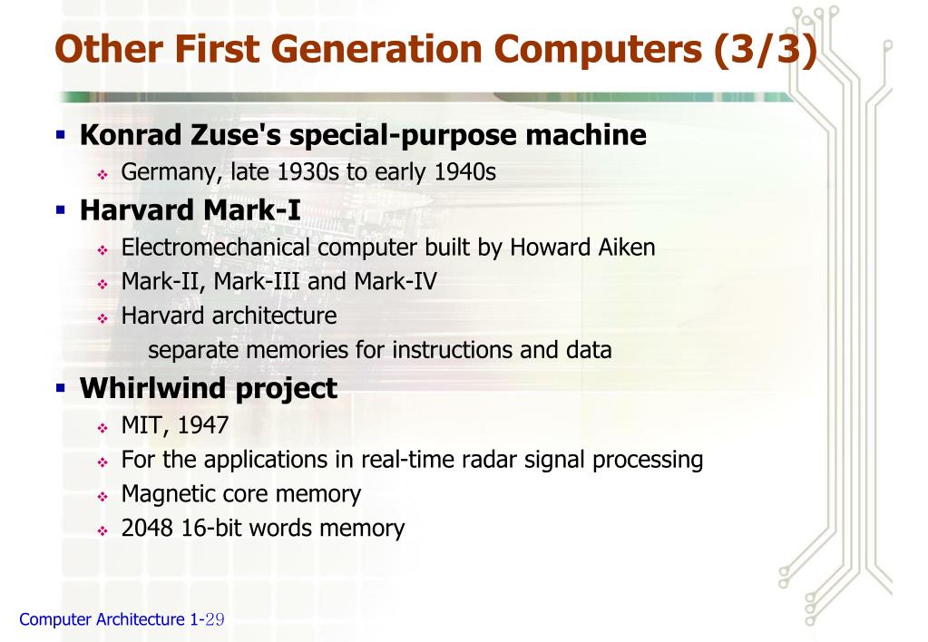 Other First Generation Computers (3/3) • Konrad Zuse's special-purpose machine • Germany, late 1930s to early 1940s • Harvard Mark-I • Electromechanical computer built by Howard Aiken • Mark-II, Mark-III and Mark-IV • Harvard architecture separate memories for instructions and data • Whirlwind project • MIT, 1947 • For the applications in real-time radar signal processing • Magnetic core memory • 2048 16-bit words memory