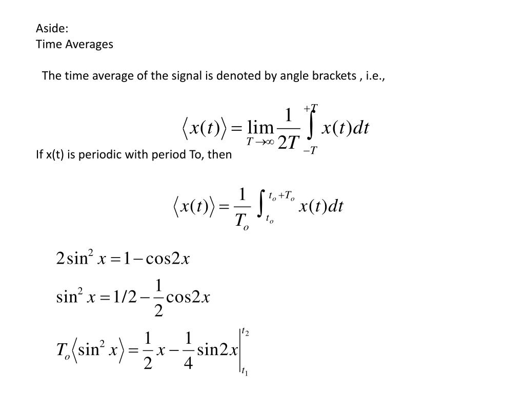 Aside: Time Averages The time average of the signal is denoted by angle brackets , i.e., If x(t) is periodic with period To, then