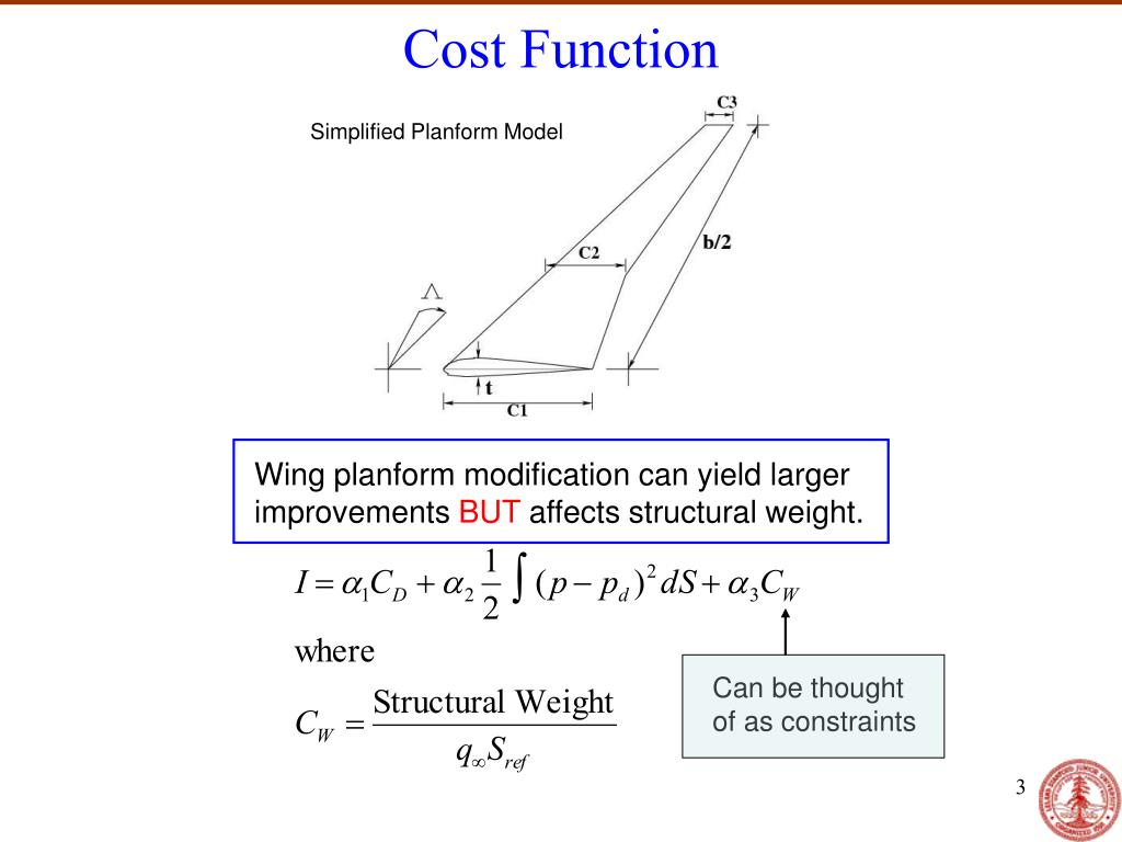Wing planform modification can yield larger improvements BUT affects structural weight. Cost Function Simplified Planform Model Can be thought of as constraints