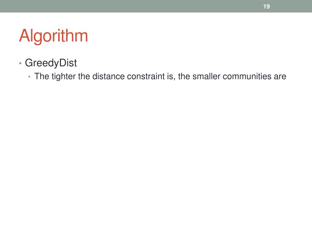 Algorithm • GreedyDist • The tighter the distance constraint is, the smaller communities are
