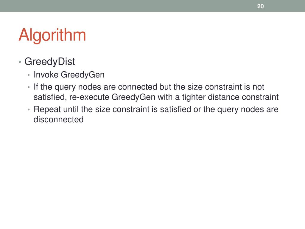 Algorithm • GreedyDist • Invoke GreedyGen • If the query nodes are connected but the size constraint is not satisfied, re-execute GreedyGen with a tighter distance constraint • Repeat until the size constraint is satisfied or the query nodes are disconnected