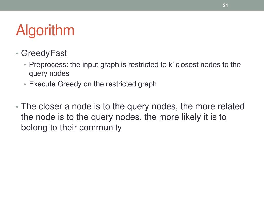Algorithm • GreedyFast • Preprocess: the input graph is restricted to k’ closest nodes to the query nodes • Execute Greedy on the restricted graph • The closer a node is to the query nodes, the more related the node is to the query nodes, the more likely it is to belong to their community