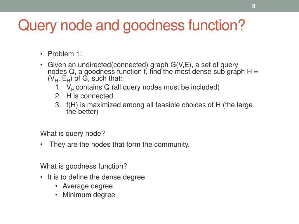 Query node and goodness function? • Problem 1: • Given an undirected(connected) graph G(V,E), a set of query nodes Q, a goodness function f, find the most dense sub graph H = (VH, EH) of G, such that: • VH contains Q (all query nodes must be included) • H is connected • f(H) is maximized among all feasible choices of H (the large the better) What is query node? • They are the nodes that form the community. What is goodness function? • It is to define the dense degree. • Average degree • Minimum degree