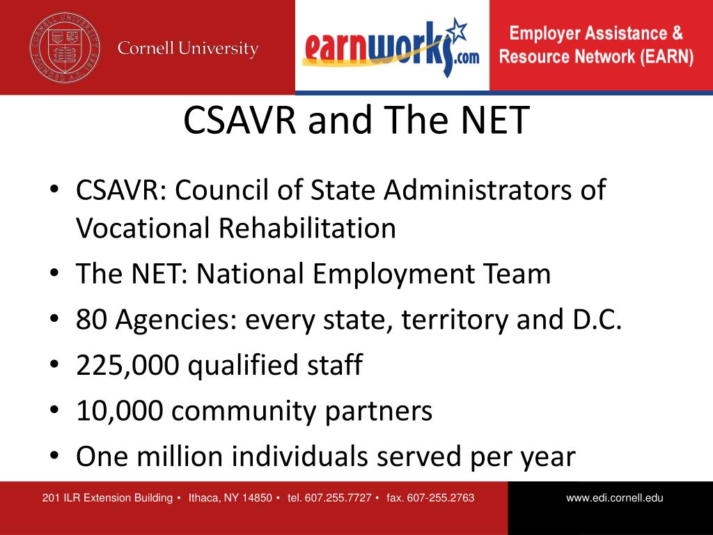 CSAVR and The NET • CSAVR: Council of State Administrators of Vocational Rehabilitation • The NET: National Employment Team • 80 Agencies: every state, territory and D.C. • 225,000 qualified staff • 10,000 community partners • One million individuals served per year