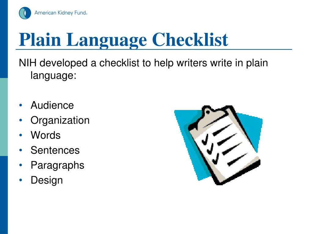 Plain Language Checklist NIH developed a checklist to help writers write in plain language: • Audience • Organization • Words • Sentences • Paragraphs • Design
