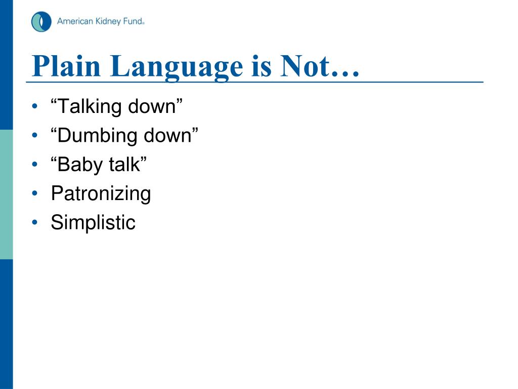 Plain Language is Not… • “Talking down” • “Dumbing down” • “Baby talk” • Patronizing • Simplistic