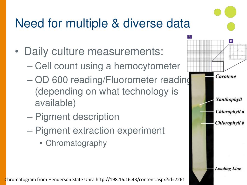 Need for multiple & diverse data • Daily culture measurements: • Cell count using a hemocytometer • OD 600 reading/Fluorometer reading (depending on what technology is available) • Pigment description • Pigment extraction experiment • Chromatography Chromatogram from Henderson State Univ. http://198.16.16.43/content.aspx?id=7261