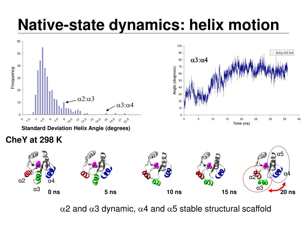 Native-state dynamics: helix motion a3:a4 a2:a3 a3:a4 Standard Deviation Helix Angle (degrees) CheY at 298 K α5 α4 α2 α2 α4 α3 α3 0 ns 5 ns 10 ns 15 ns 20 ns a2 and a3 dynamic, a4 and a5 stable structural scaffold