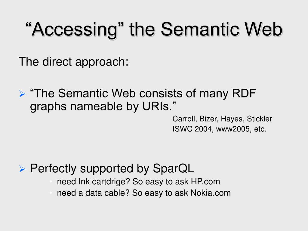 “Accessing” the Semantic Web The direct approach: • “The Semantic Web consists of many RDF graphs nameable by URIs.” Carroll, Bizer, Hayes, Stickler ISWC 2004, www2005, etc. • Perfectly supported by SparQL • need Ink cartdrige? So easy to ask HP.com • need a data cable? So easy to ask Nokia.com
