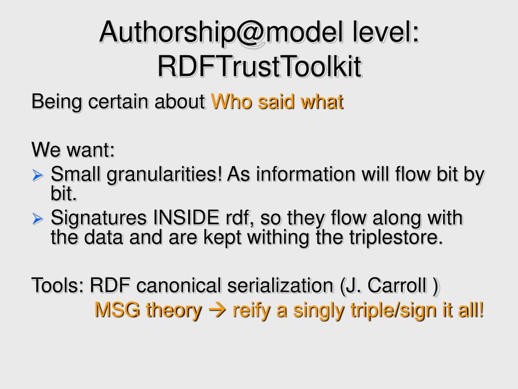 Authorship@model level: RDFTrustToolkit Being certain about Who said what We want: • Small granularities! As information will flow bit by bit. • Signatures INSIDE rdf, so they flow along with the data and are kept withing the triplestore. Tools: RDF canonical serialization (J. Carroll ) MSG theory reify a singly triple/sign it all!