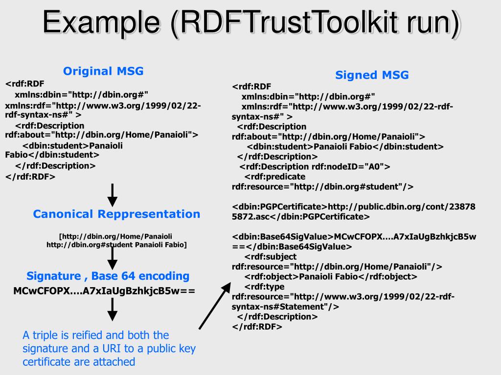Example (RDFTrustToolkit run) Original MSG <rdf:RDF xmlns:dbin="http://dbin.org#" xmlns:rdf="http://www.w3.org/1999/02/22-rdf-syntax-ns#" > <rdf:Description rdf:about="http://dbin.org/Home/Panaioli"> <dbin:student>Panaioli Fabio</dbin:student> </rdf:Description> </rdf:RDF> Signed MSG <rdf:RDF xmlns:dbin="http://dbin.org#" xmlns:rdf="http://www.w3.org/1999/02/22-rdf-syntax-ns#" > <rdf:Description rdf:about="http://dbin.org/Home/Panaioli"> <dbin:student>Panaioli Fabio</dbin:student> </rdf:Description> <rdf:Description rdf:nodeID="A0"> <rdf:predicate rdf:resource="http://dbin.org#student"/> <dbin:PGPCertificate>http://public.dbin.org/cont/238785872.asc</dbin:PGPCertificate> <dbin:Base64SigValue>MCwCFOPX….A7xIaUgBzhkjcB5w==</dbin:Base64SigValue> <rdf:subject rdf:resource="http://dbin.org/Home/Panaioli"/> <rdf:object>Panaioli Fabio</rdf:object> <rdf:type rdf:resource="http://www.w3.org/1999/02/22-rdf-syntax-ns#Statement"/> </rdf:Description> </rdf:RDF> Canonical Reppresentation [http://dbin.org/Home/Panaioli http://dbin.org#student Panaioli Fabio] Signature , Base 64 encoding MCwCFOPX….A7xIaUgBzhkjcB5w== A triple is reified and both the signature and a URI to a public key certificate are attached