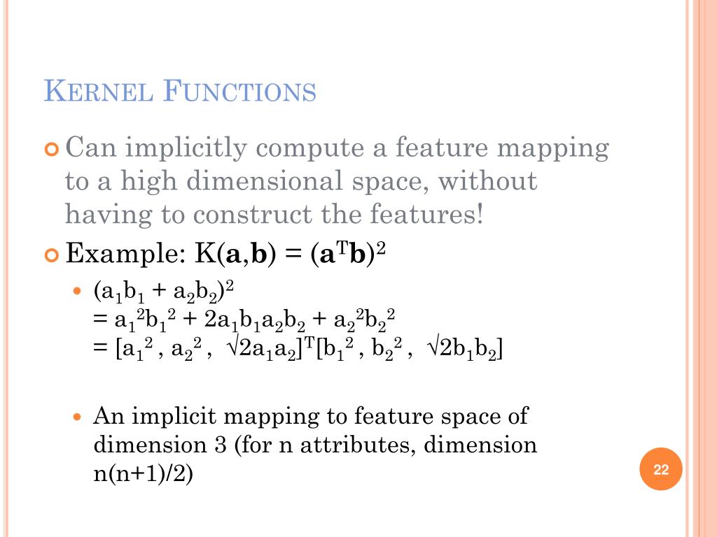 Kernel Functions • Can implicitly compute a feature mapping to a high dimensional space, without having to construct the features! • Example: K(a,b) = (aTb)2 • (a1b1 + a2b2)2= a12b12 + 2a1b1a2b2 + a22b22= [a12, a22 , 2a1a2]T[b12, b22 , 2b1b2] • An implicit mapping to feature space of dimension 3 (for n attributes, dimension n(n+1)/2)