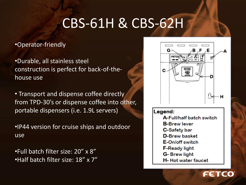 Overview • The 6000 Series Equipment: CBS-61H & CBS-62H • Gravity Dispense Tube • Good Brewing Execution • 8 Elements for Good Brewing Execution • 6000 Series features that Promote Good Brewing Execution • Selecting The Right Equipment • Electrical Configuration at the Location • Cups/Hour • TPD-30 3.0 Gallon Dispenser • Package Offering
