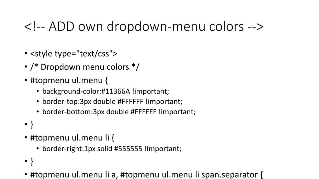 <!-- ADD own dropdown-menu colors --> • <style type="text/css"> • /* Dropdown menu colors */ • #topmenu ul.menu { • background-color:#11366A !important; • border-top:3px double #FFFFFF !important; • border-bottom:3px double #FFFFFF !important; • } • #topmenu ul.menu li { • border-right:1px solid #555555 !important; • } • #topmenu ul.menu li a, #topmenu ul.menu li span.separator { • border-top:1px solid #000000 !important; • border-right:1px solid #222222 !important; • border-left:1px solid #000000 !important; • border-bottom:1px solid #333333 !important; • color:#FFFFFF; • background-color:#11366A; • } • #topmenu ul.menu a:hover { • color:#CCCCCC; • } • /** LEVEL 2 **/ • #topmenu ul.menu ul { • border:2px solid #000000 !important; • background-color:#11366A; • } • #topmenu ul.menu li ul li a, #topmenu ul.menu li ul li span.separator { • border-top:1px solid #000000 !important; • border-right:1px solid #333333 !important; • border-left:1px solid #333333 !important; • border-bottom:1px solid #333333 !important; • color:#FFFFFF; • } • #topmenu ul.menu li ul li a:hover { • color:#FFFFFF; • } • #topmenu ul.menu li li { • background-color:#4782B1; • } • #topmenu ul.menu li li:hover { • background-color:#3D3D3D; • }