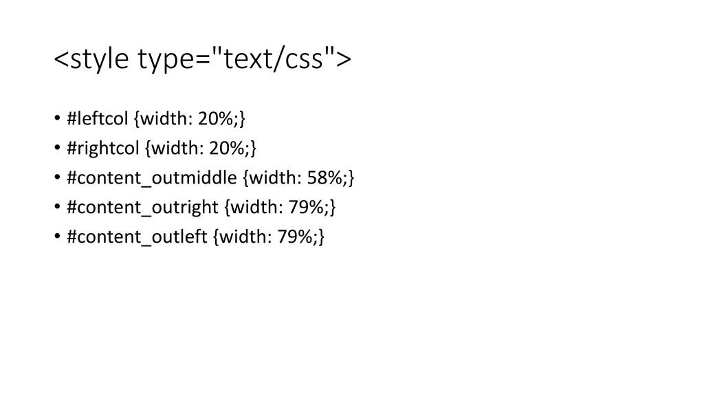 <style type="text/css"> • #leftcol {width: 20%;} • #rightcol {width: 20%;} • #content_outmiddle {width: 58%;} • #content_outright {width: 79%;} • #content_outleft {width: 79%;}