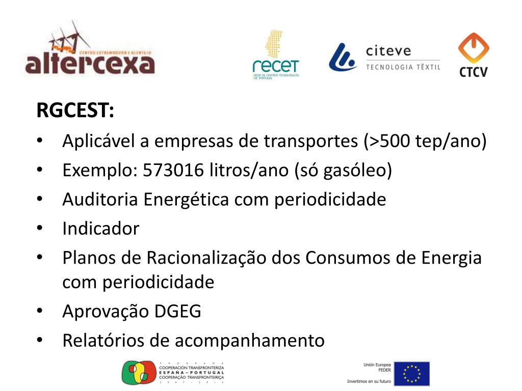 RGCEST: Aplicável a empresas de transportes (>500 tep/ano) Exemplo: 573016 litros/ano (só gasóleo) Auditoria Energética com periodicidade Indicador Planos de Racionalização dos Consumos de Energia com periodicidade Aprovação DGEG Relatórios de acompanhamento