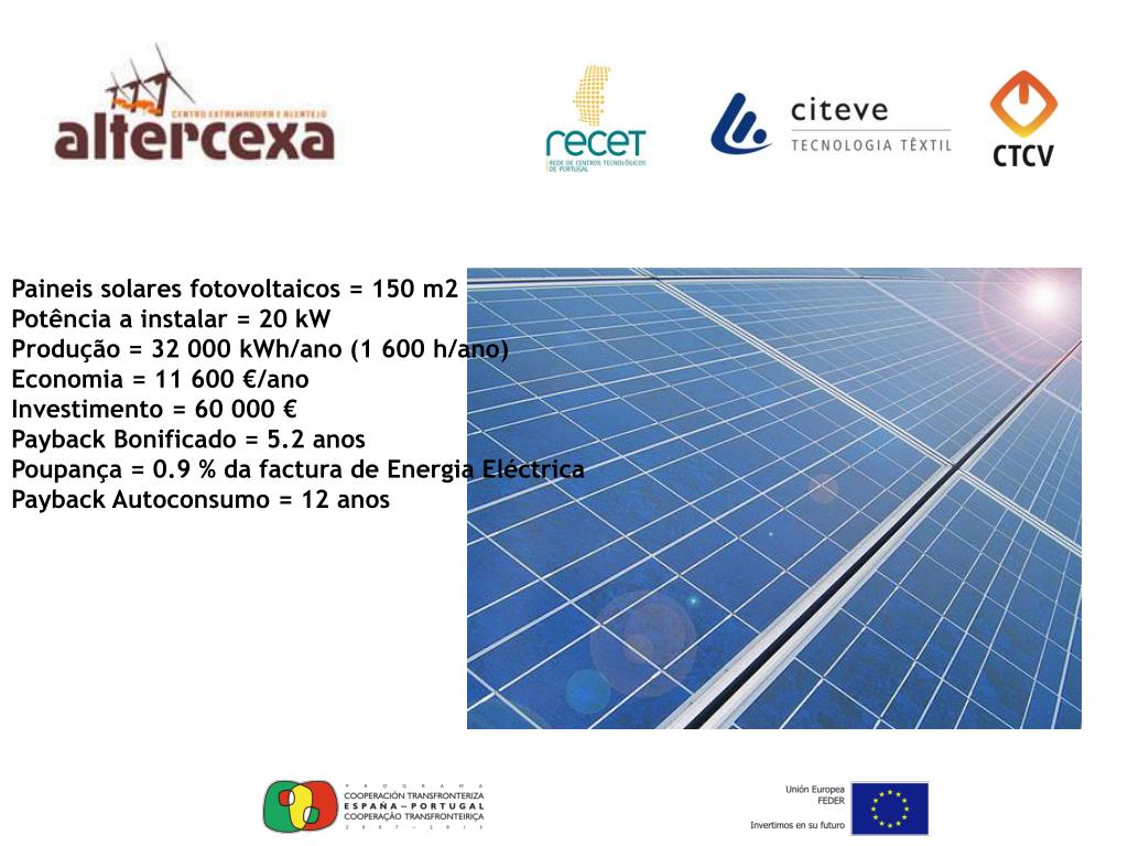Paineis solares fotovoltaicos = 150 m2 Potência a instalar = 20 kW Produção = 32 000 kWh/ano (1 600 h/ano) Economia = 11 600 €/ano Investimento = 60 000 € Payback Bonificado = 5.2 anos Poupança = 0.9 % da factura de Energia Eléctrica Payback Autoconsumo = 12 anos