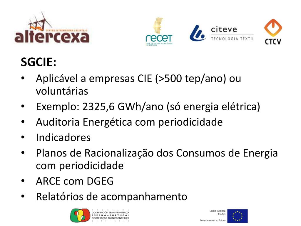 SGCIE: Aplicável a empresas CIE (>500 tep/ano) ou voluntárias Exemplo: 2325,6 GWh/ano (só energia elétrica) Auditoria Energética com periodicidade Indicadores Planos de Racionalização dos Consumos de Energia com periodicidade ARCE com DGEG Relatórios de acompanhamento