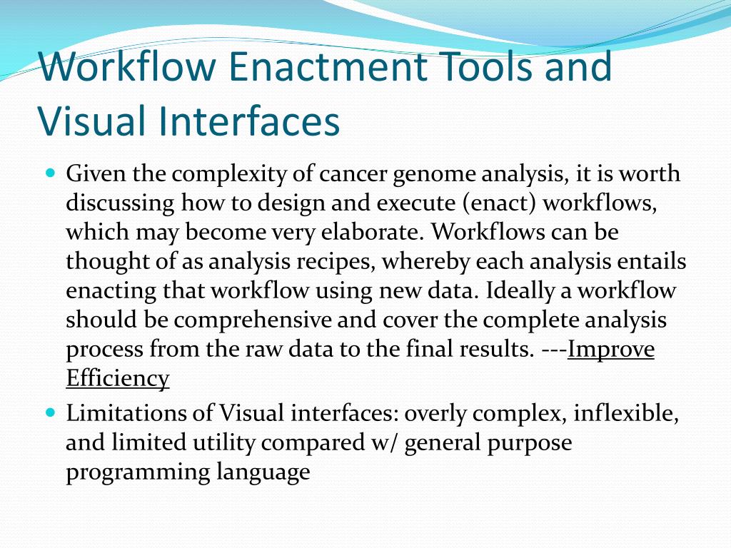 Workflow Enactment Tools and Visual Interfaces • Given the complexity of cancer genome analysis, it is worth discussing how to design and execute (enact) workflows, which may become very elaborate. Workflows can be thought of as analysis recipes, whereby each analysis entails enacting that workflow using new data. Ideally a workflow should be comprehensive and cover the complete analysis process from the raw data to the final results. ---Improve Efficiency • Limitations of Visual interfaces: overly complex, inflexible, and limited utility compared w/ general purpose programming language