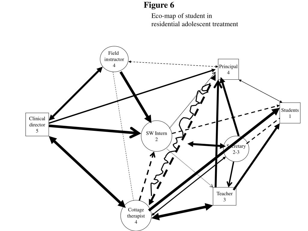 Figure 6 Eco-map of student in residential adolescent treatment Field instructor 4 Principal 4 Students 1 Clinical director 5 SW Intern 2 Secretary 2-3 Teacher 3 Cottage therapist 4