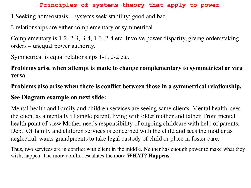 Principles of systems theory that apply to power 1.Seeking homeostasis – systems seek stability; good and bad 2.relationships are either complementary or symmetrical Complementary is 1-2, 2-3,-3-4, 1-3, 2-4 etc. Involve power disparity, giving orders/taking orders – unequal power authority. Symmetrical is equal relationships 1-1, 2-2 etc. Problems arise when attempt is made to change complementary to symmetrical or vica versa Problems also arise when there is conflict between those in a symmetrical relationship. See Diagram example on next slide: Mental health and Family and children services are seeing same clients. Mental health sees the client as a mentally ill single parent, living with older mother and father. From mental health point of view Mother needs responsibility of ongoing childcare with help of parents. Dept. Of family and children services is concerned with the child and sees the mother as neglectful, wants grandparents to take legal custody of child or place in foster care. Thus, two services are in conflict with client in the middle. Neither has enough power to make what they wish, happen. The more conflict escalates the more WHAT? Happens.