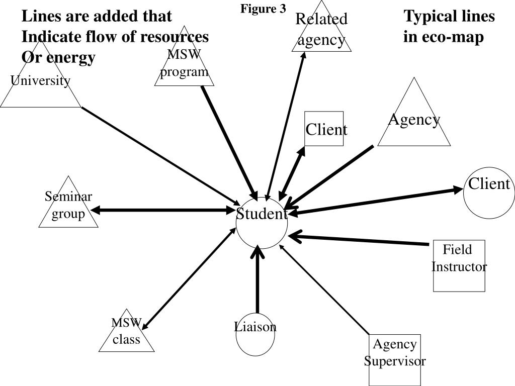 Figure 3 Related agency Lines are added that Indicate flow of resources Or energy Typical lines in eco-map MSW program University Agency Client Client Seminar group Student Field Instructor MSW class Liaison Agency Supervisor