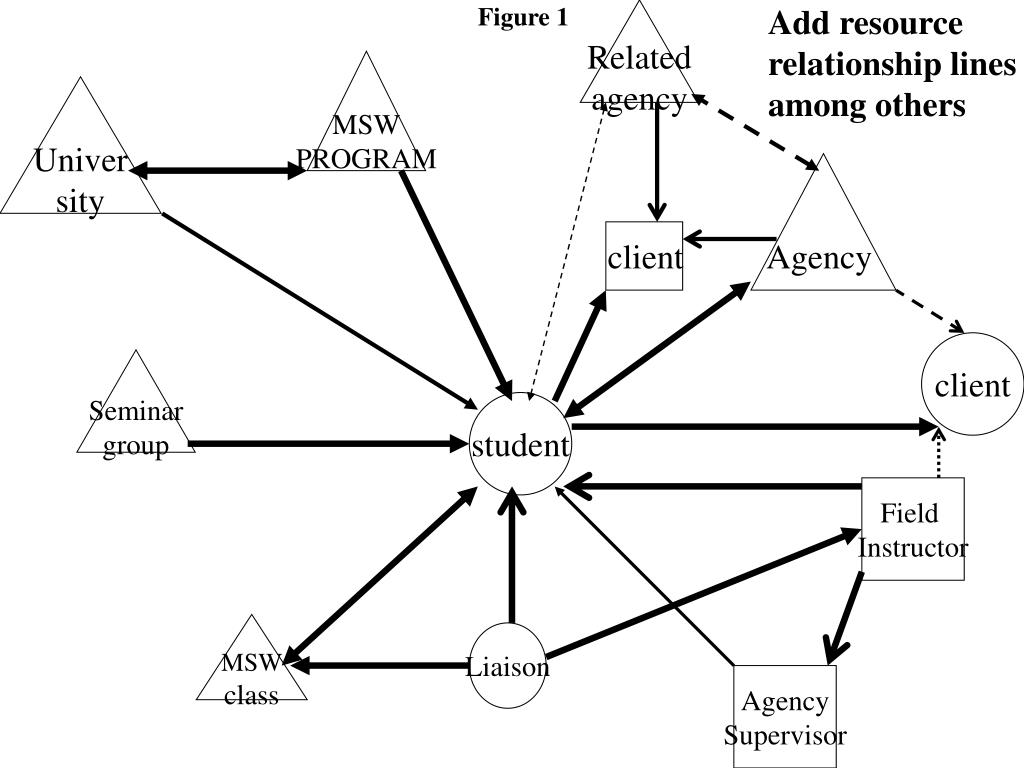 Figure 1 Add resource relationship lines among others Related agency MSW PROGRAM Univer sity Agency client client Seminar group student Field Instructor MSW class Liaison Agency Supervisor