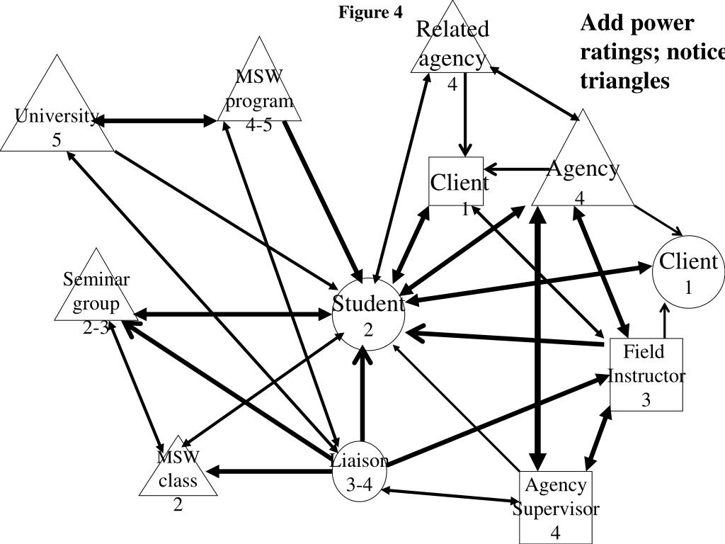 Figure 4 Related agency 4 Add power ratings; notice triangles MSW program 4-5 University 5 Agency 4 Client 1 Client 1 Seminar group 2-3 Student 2 Field Instructor 3 MSW class 2 Liaison 3-4 Agency Supervisor 4