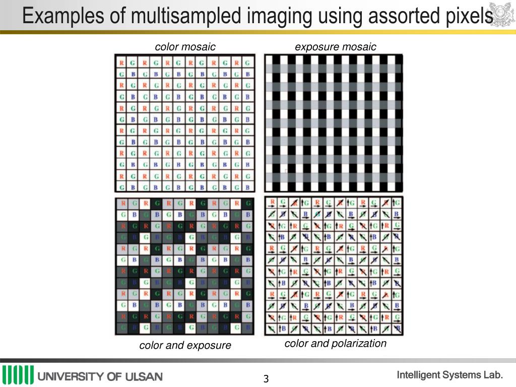 Examples of multisampled imaging using assorted pixels color mosaic exposure mosaic color and polarization color and exposure
