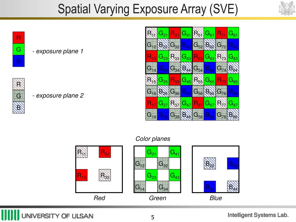 Spatial Varying Exposure Array (SVE) Color planes G21 R11 R31 G41 G12 G32 B22 B42 R13 R33 G23 G43 G14 G34 B24 B44 Red Green Blue G21 G61 R11 R31 G41 R51 R71 G81 R G12 B22 G32 B42 G52 B62 G72 B82 G - exposure plane 1 R13 G23 R33 G43 R53 G63 R73 G83 B G14 B24 G34 B44 G54 B64 G74 B84 G25 G65 R15 R35 G45 R55 R75 G85 R G16 B26 G36 B46 G56 B66 G76 B86 G - exposure plane 2 R17 G27 R37 G47 R57 G67 R77 G87 B G18 B28 G38 B48 G58 B68 G78 B88