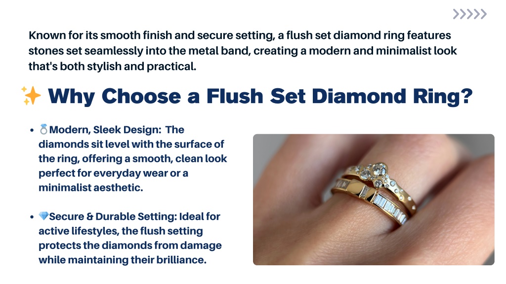 Known for its smooth finish and secure setting, a flush set diamond ring features stones set seamlessly into the metal band, creating a modern and minimalist look that's both stylish and practical. ✨ Why Choose a Flush Set Diamond Ring? ?Modern, Sleek Design: The diamonds sit level with the surface of the ring, offering a smooth, clean look perfect for everyday wear or a minimalist aesthetic. ?Secure & Durable Setting: Ideal for active lifestyles, the flush setting protects the diamonds from damage while maintaining their brilliance.