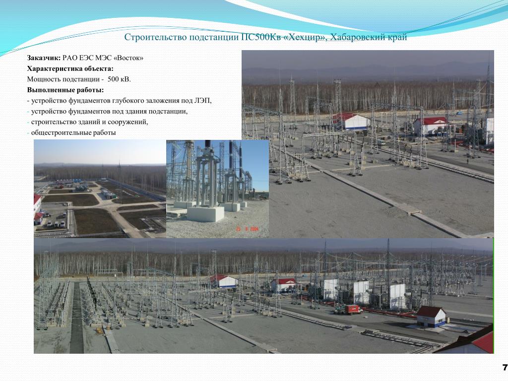Строительство подстанции ПС500Кв «Хехцир», Хабаровский край Заказчик: РАО ЕЭС МЭС «Восток» Характеристика объекта: Мощность подстанции - 500 кВ. Выполненные работы: - устройство фундаментов глубокого заложения под ЛЭП, устройство фундаментов под здания подстанции, строительство зданий и сооружений, общестроительные работы