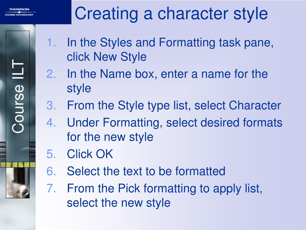 Creating a character style • In the Styles and Formatting task pane, click New Style • In the Name box, enter a name for the style • From the Style type list, select Character • Under Formatting, select desired formats for the new style • Click OK • Select the text to be formatted • From the Pick formatting to apply list, select the new style