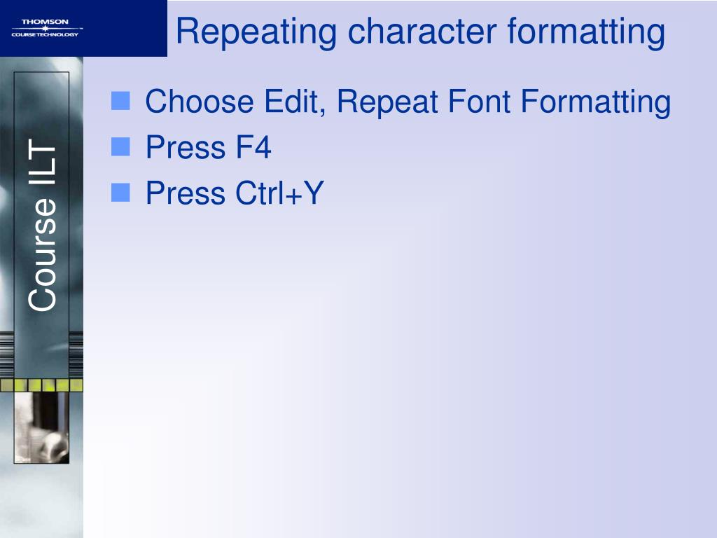Repeating character formatting • Choose Edit, Repeat Font Formatting • Press F4 • Press Ctrl+Y