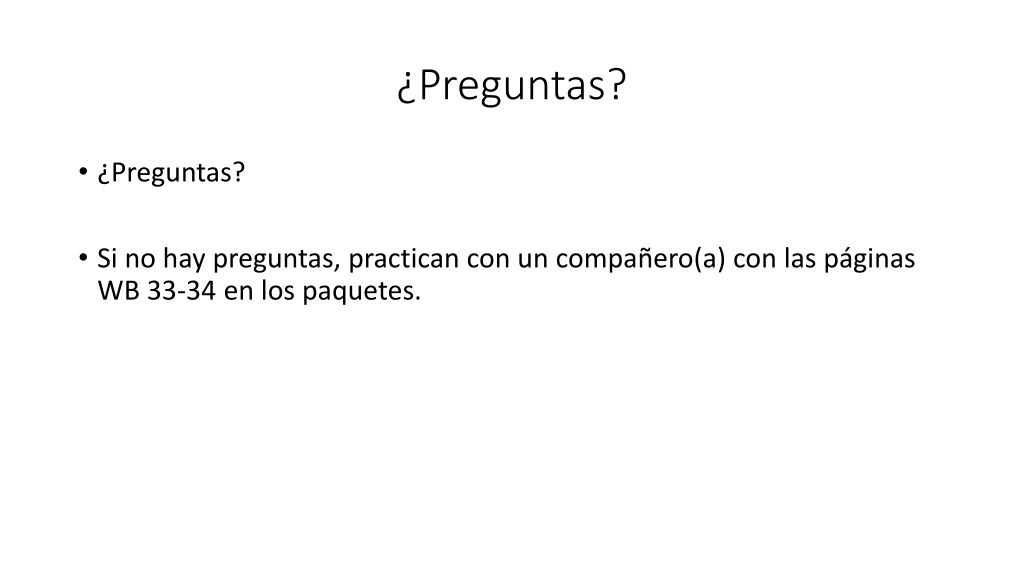 ¿Preguntas? • ¿Preguntas? • Si no hay preguntas, practican con un compañero(a) con laspáginas WB 33-34 en los paquetes.