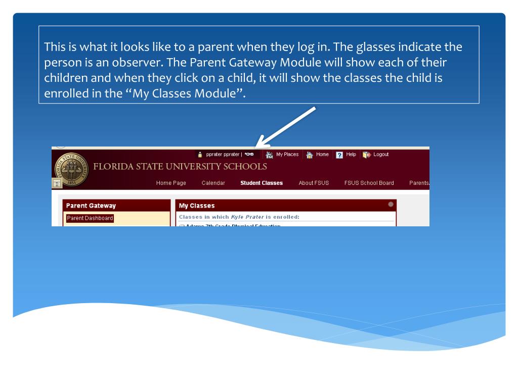 This is what it looks like to a parent when they log in. The glasses indicate the person is an observer. The Parent Gateway Module will show each of their children and when they click on a child, it will show the classes the child is enrolled in the “My Classes Module”.