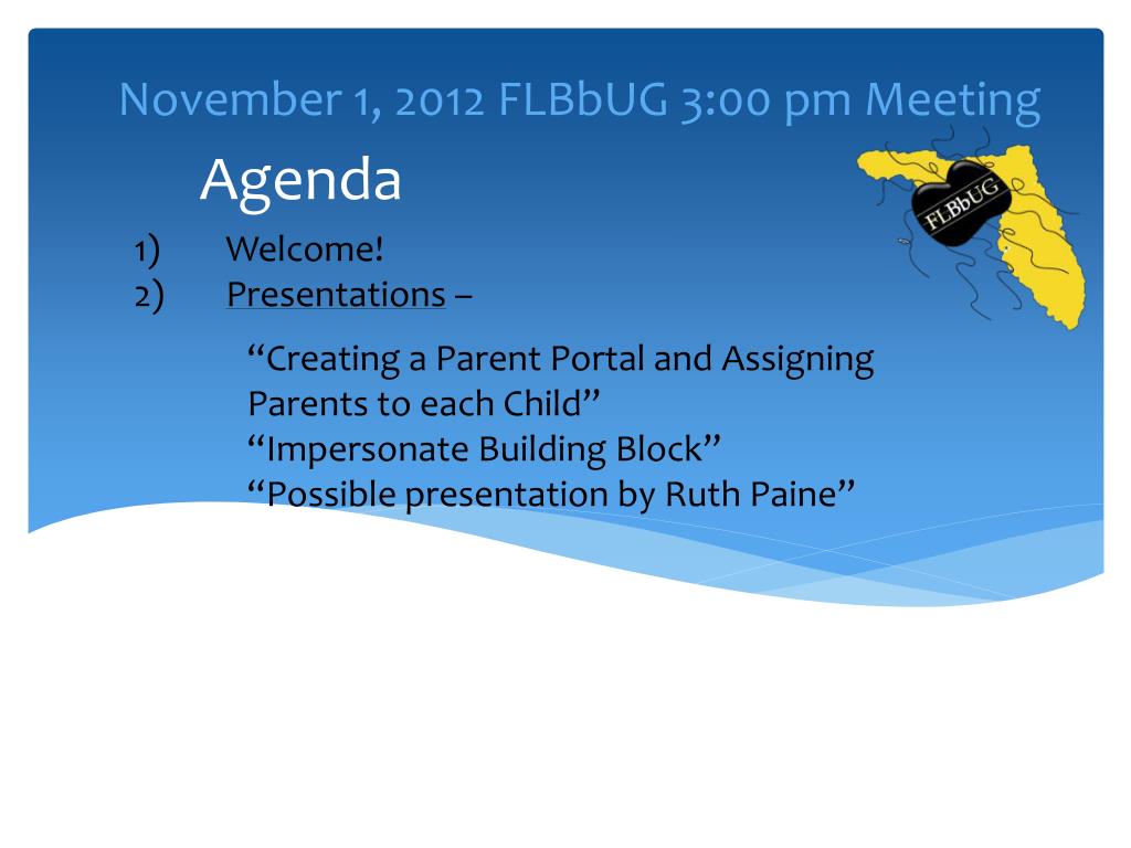 November 1, 2012 FLBbUG 3:00 pm Meeting Agenda Welcome! Presentations – “Creating a Parent Portal and Assigning Parents to each Child” “Impersonate Building Block” “Possible presentation by Ruth Paine”
