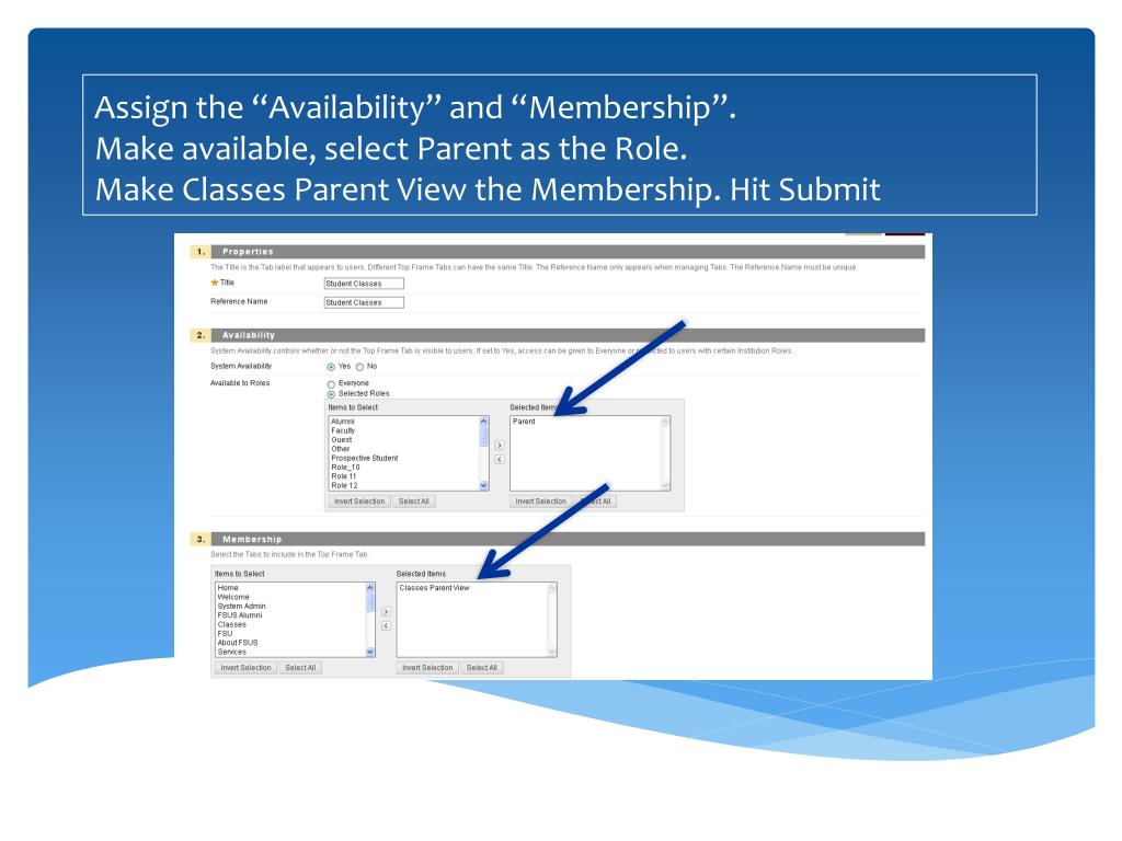 Assign the “Availability” and “Membership”. Make available, select Parent as the Role.Make Classes Parent View the Membership. Hit Submit