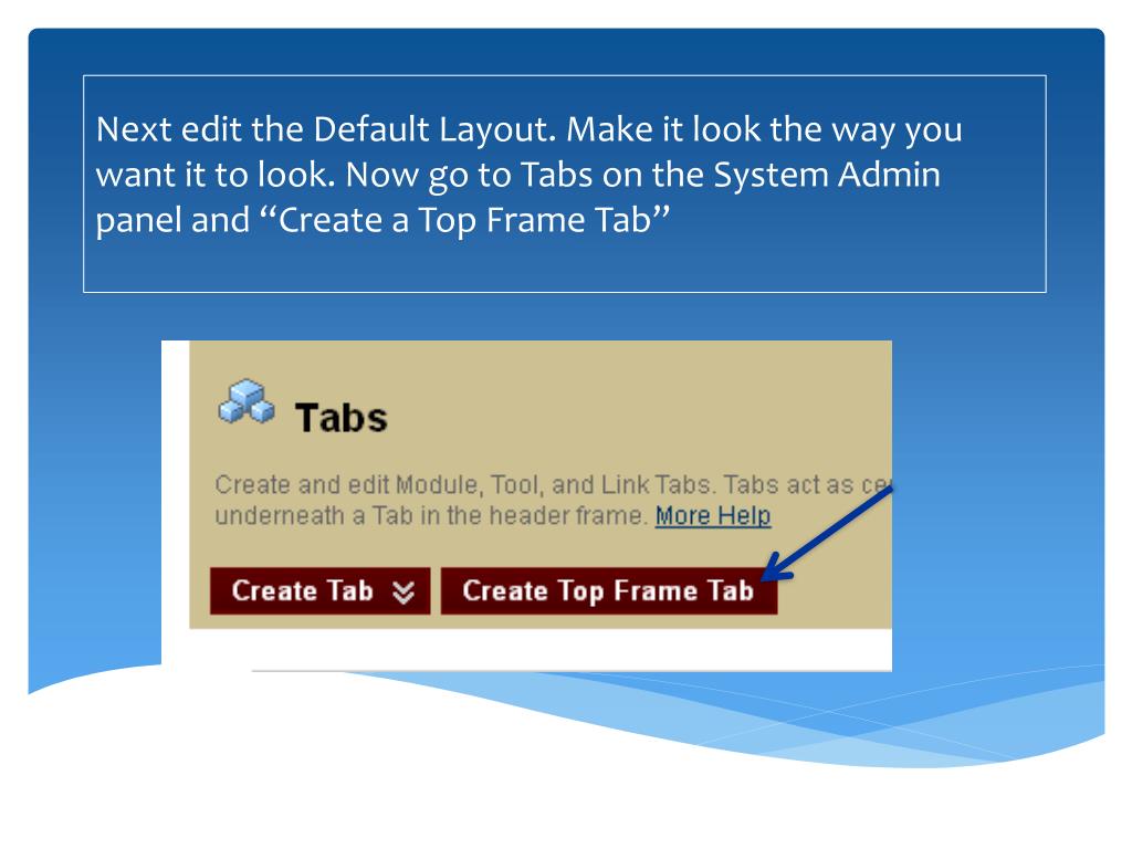Next edit the Default Layout. Make it look the way you want it to look. Now go to Tabs on the System Admin panel and “Create a Top Frame Tab”