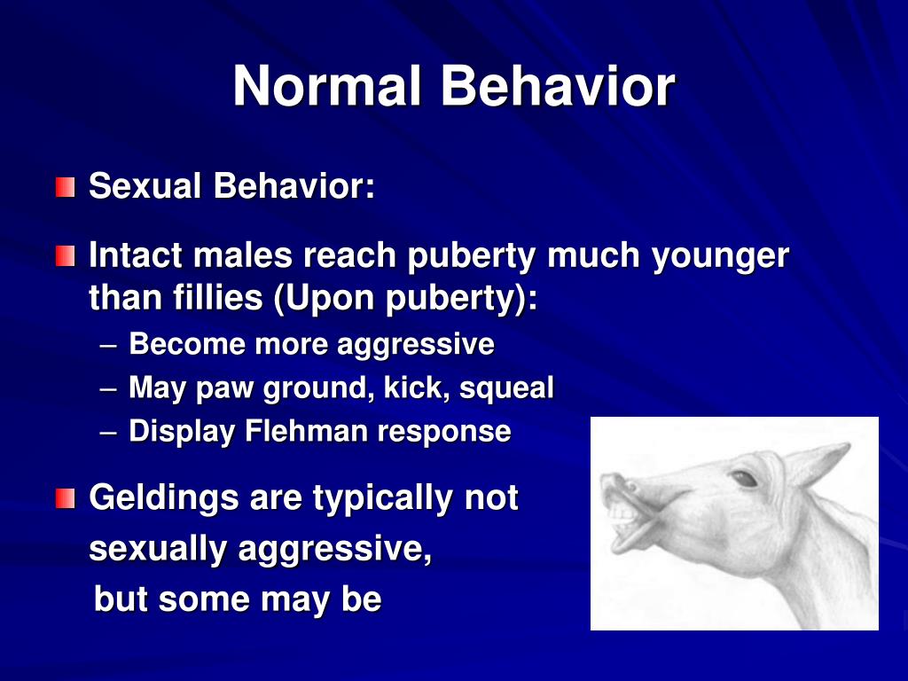 Normal Behavior • Sexual Behavior: • Intact males reach puberty much younger than fillies (Upon puberty): • Become more aggressive • May paw ground, kick, squeal • Display Flehman response • Geldings are typically not sexually aggressive, but some may be