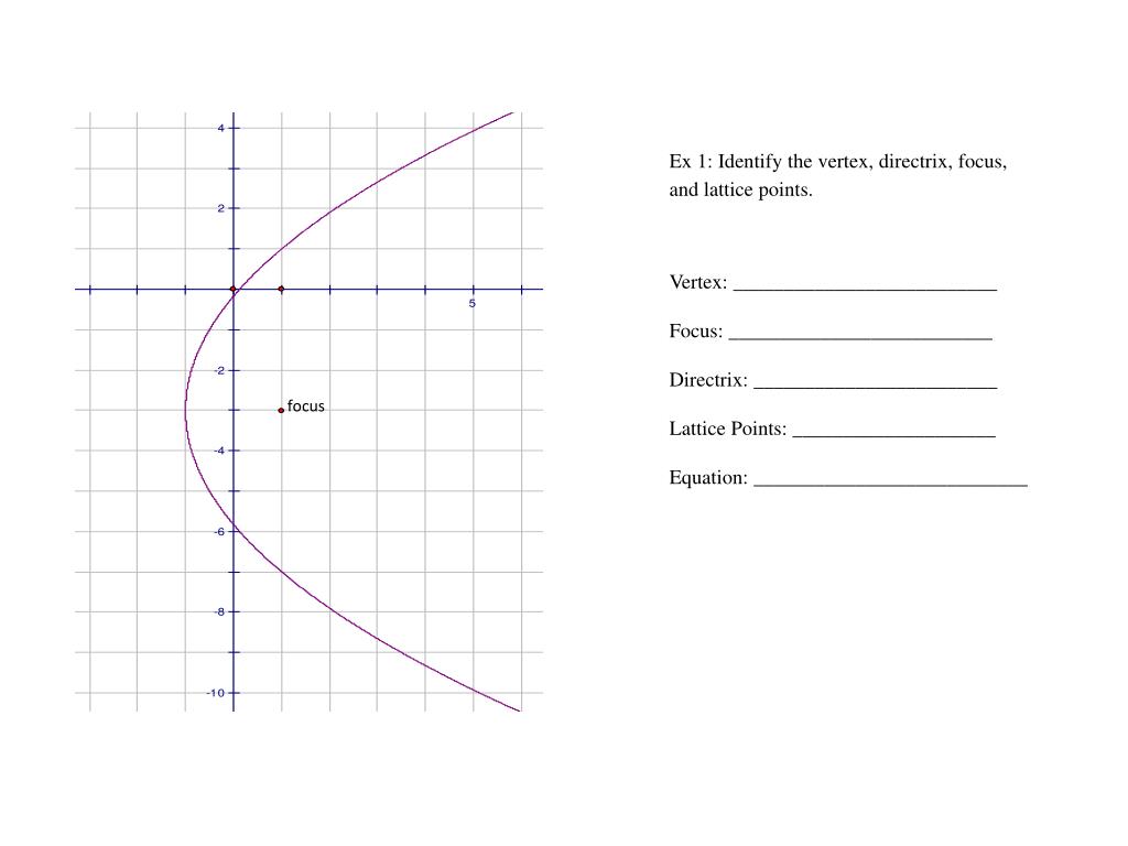 Ex 1: Identify the vertex, directrix, focus, and lattice points. Vertex: __________________________ Focus: __________________________ Directrix: ________________________ Lattice Points: ____________________ Equation: ___________________________ focus