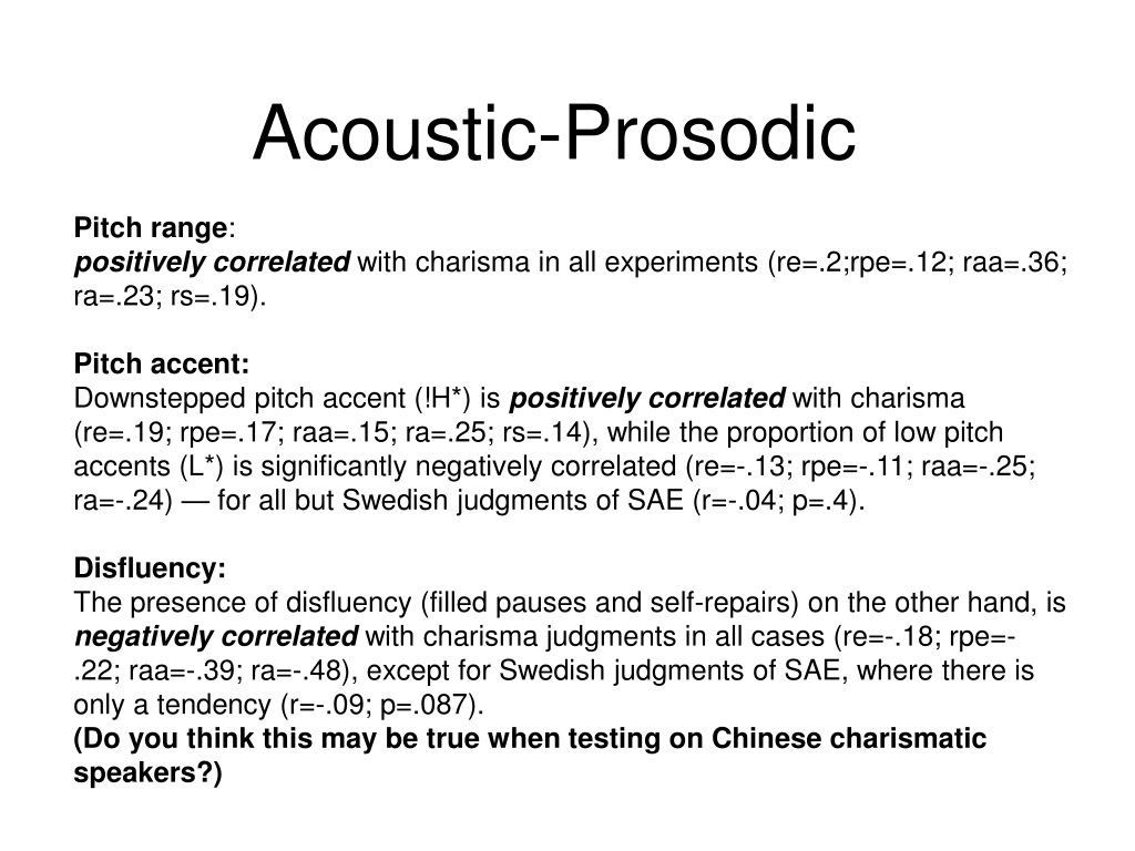 Acoustic-Prosodic • Pitch range: • positively correlated with charisma in all experiments (re=.2;rpe=.12; raa=.36; • ra=.23; rs=.19). • Pitch accent: • Downstepped pitch accent (!H*) is positively correlated with charisma (re=.19; rpe=.17; raa=.15; ra=.25; rs=.14), while the proportion of low pitch accents (L*) is significantly negatively correlated (re=-.13; rpe=-.11; raa=-.25; ra=-.24) — for all but Swedish judgments of SAE (r=-.04; p=.4). • Disfluency: • The presence of disfluency (filled pauses and self-repairs) on the other hand, is negatively correlated with charisma judgments in all cases (re=-.18; rpe=- • .22; raa=-.39; ra=-.48), except for Swedish judgments of SAE, where there is only a tendency (r=-.09; p=.087). • (Do you think this may be true when testing on Chinese charismatic speakers?)