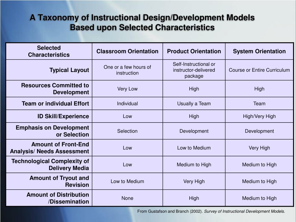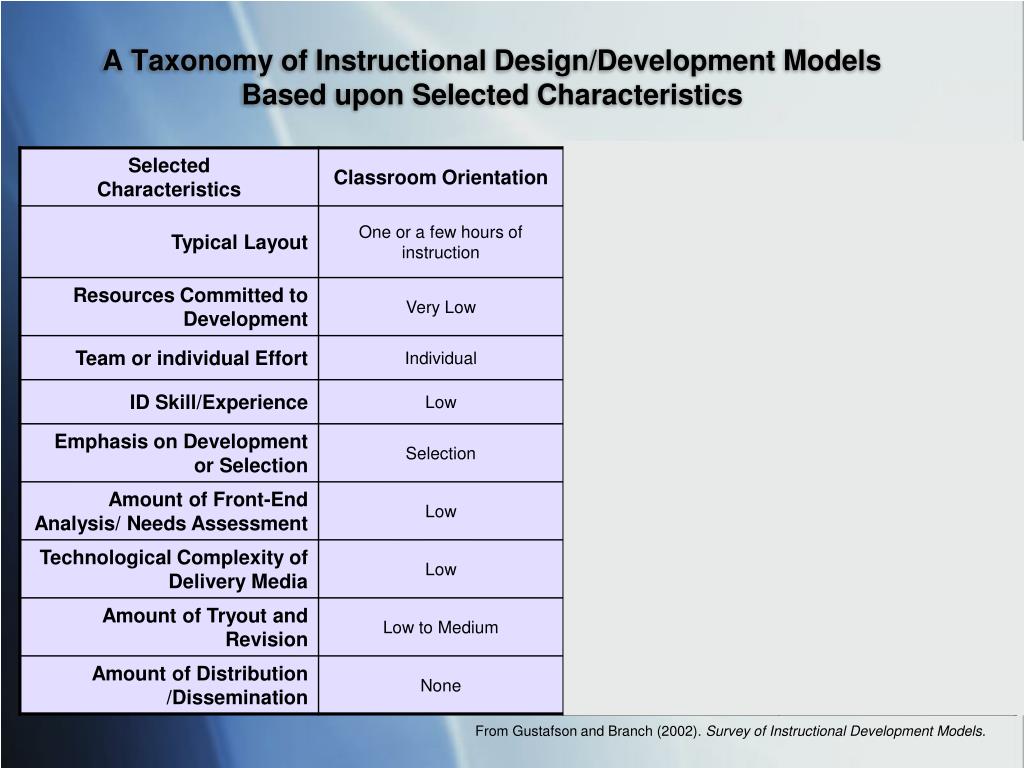 A Taxonomy of Instructional Design/Development Models Based upon Selected Characteristics From Gustafson and Branch (2002). Survey of Instructional Development Models.