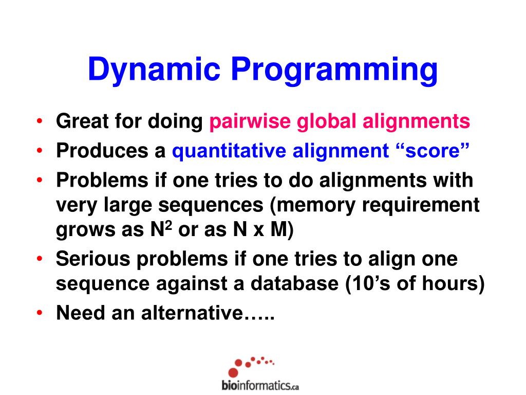 Dynamic Programming • Great for doing pairwise global alignments • Produces a quantitative alignment “score” • Problems if one tries to do alignments with very large sequences (memory requirement grows as N2 or as N x M) • Serious problems if one tries to align one sequence against a database (10’s of hours) • Need an alternative…..