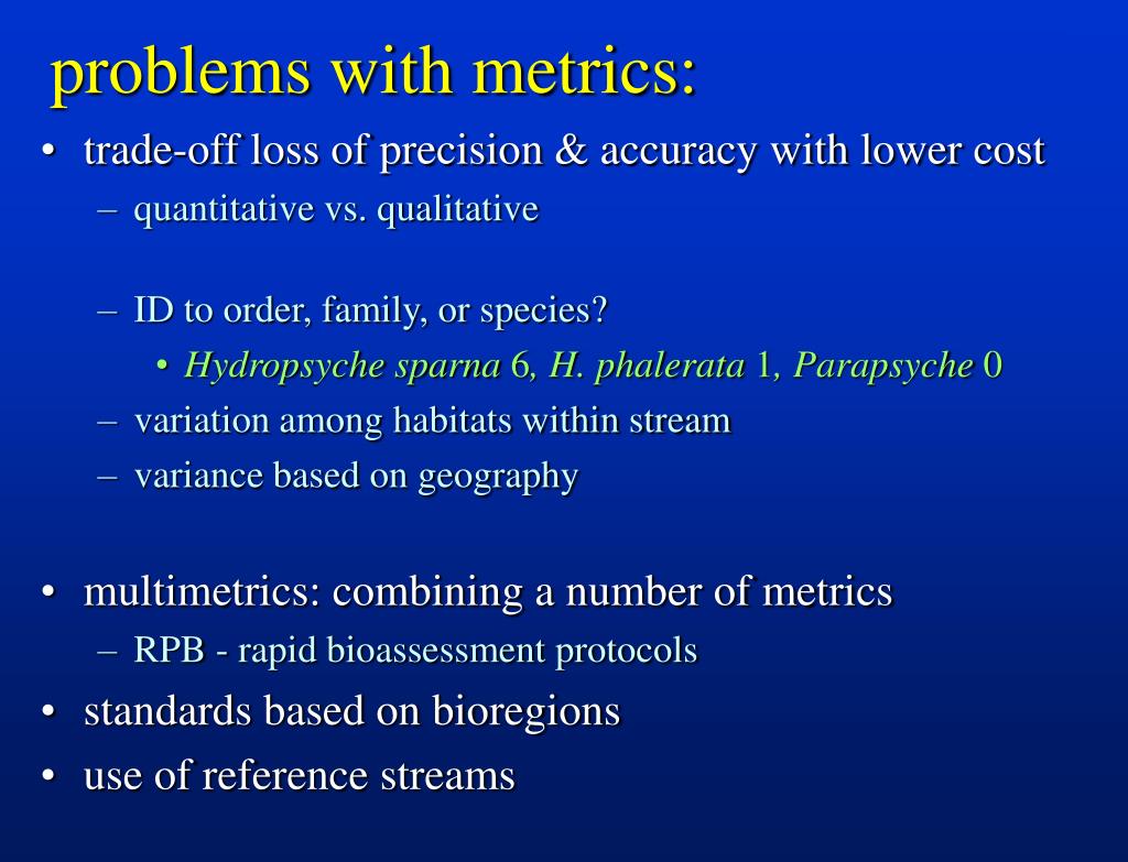 trade-off loss of precision & accuracy with lower cost quantitative vs. qualitative ID to order, family, or species? Hydropsyche sparna 6, H. phalerata 1, Parapsyche 0 variation among habitats within stream variance based on geography multimetrics: combining a number of metrics RPB - rapid bioassessment protocols standards based on bioregions use of reference streams problems with metrics: