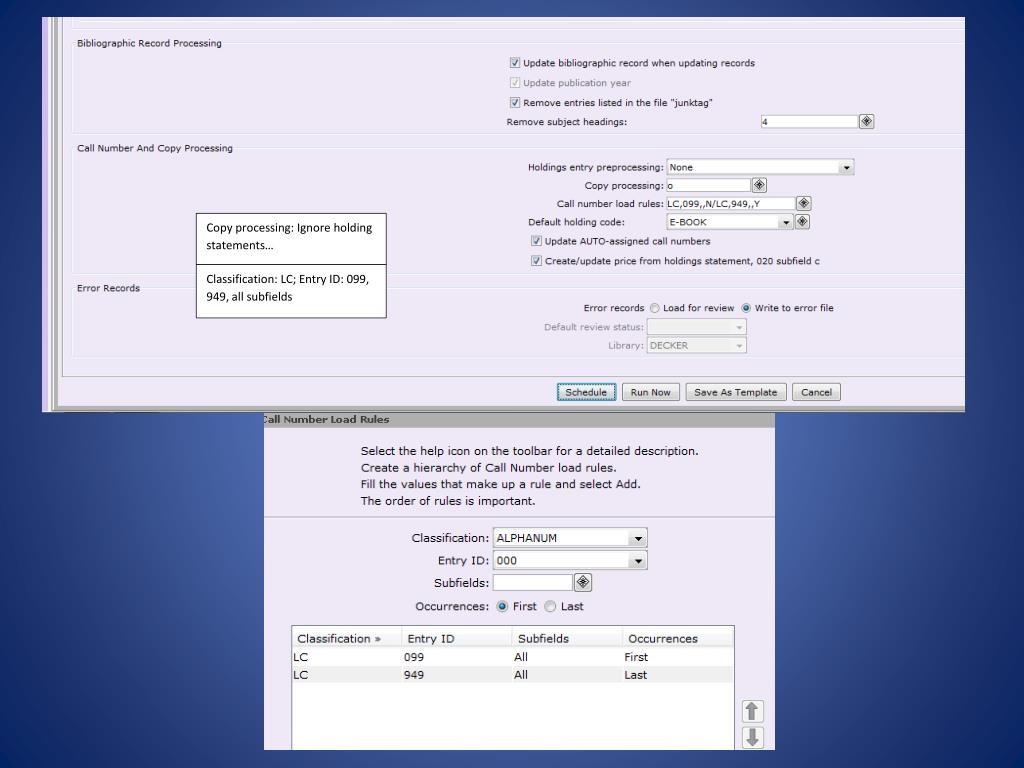 Copy processing: Ignore holding statements… Classification: LC; Entry ID: 099, 949, all subfields