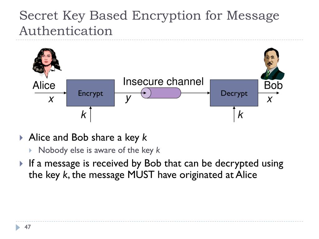 Secret Key Based Encryption for Message Authentication • Alice and Bob share a key k • Nobody else is aware of the key k • If a message is received by Bob that can be decrypted using the key k, the message MUST have originated at Alice Insecure channel Alice Bob Encrypt Decrypt y x x k k